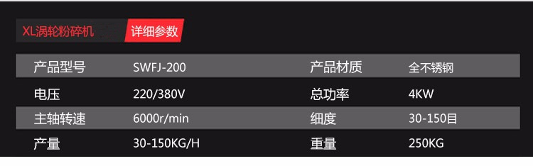 名稱渦輪粉碎機(jī) 電源 功率 產(chǎn)量 尺寸 重量 規(guī)格 其他